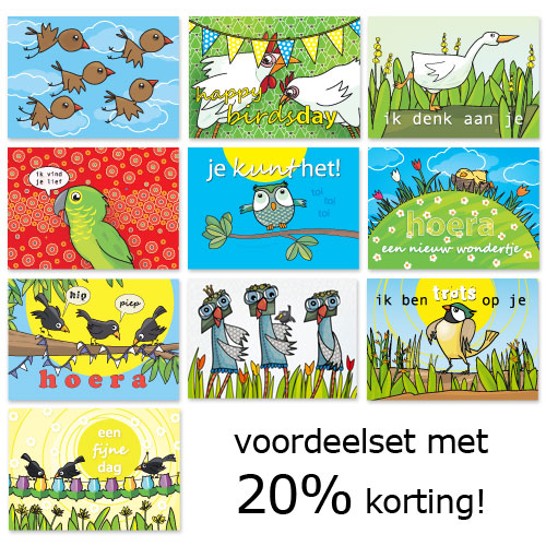 Set van 10 superleuke vogelpostkaarten.Per set extra voordelig, geen €7,50, maar slechts €6.00! Dat is dus 20% korting! Jij is Lief-postkaarten zijn ook los verkrijgbaar.